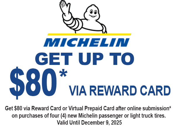 Get $80 via Reward Card or Virtual Prepaid Card after online submission* on purchases of four (4) new Michelin passenger or light truck tires.